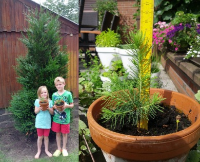Beim ersten Foto mussten wir zweimal hinsehen: 2,50m in einem Jahr? Das riecht nach Betrug und Sabotage. Aber es geht gar nicht um die Fichte im Hintergrund, sondern um die Gewächse in den Blumentöpfen.